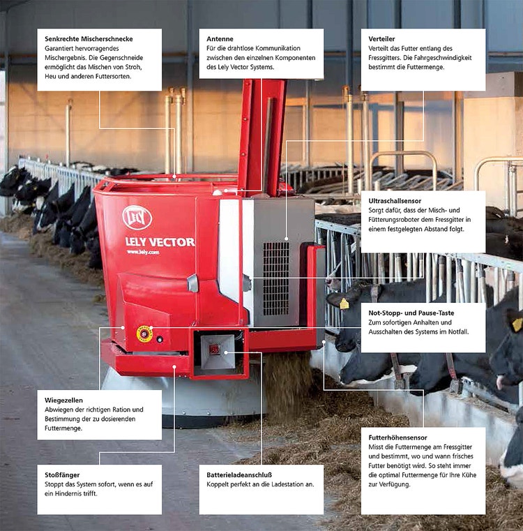 Der MFR übernimmt neben dem Mischen der individuellen Rationen und dem Ausbringen des Futters, auch das Futteranschieben und das Messen der Futterhöhe. Der MFR schiebt stündlich das Futter am Futtertisch an und misst dabei die Höhe des Futters. Bei Bedarf wird in der Futterküche eine frische, gruppenindividuelle Ration im MFR gemischt und am Futtertisch ausgebracht. Der MFR ist in der Lage Rationen von 50 kg bis 800 kg zu mischen. Er überzeugt durch höchste Genauigkeit beim Mischen und Ausbringen. Der selbstfahrende Lely Misch- und Fütterungsroboter orientiert sich im Stall mittels Ultraschallsensor am Fressgitter und an Wänden. Außerhalb des Stalles folgt er Metallstreifen die auf dem Boden befestigt werden.